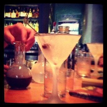 So, The Squeaky Bean is housed in one of those nondescript downtown buildings that has a vaguely historical feel, but once you step inside, this place has considerably more character. The recessed dining room touts exposed brick walls, a giant Bingo board with various numbers lit up, and metallic chandeliers made from random things like reflective glass or silver spoons. Naturally, we sat at the bar, which was decorated with rows of Mason jars filled colorful, house-made cocktail cherries—oh, and a Farrah Fawcett shrine. Seriously.