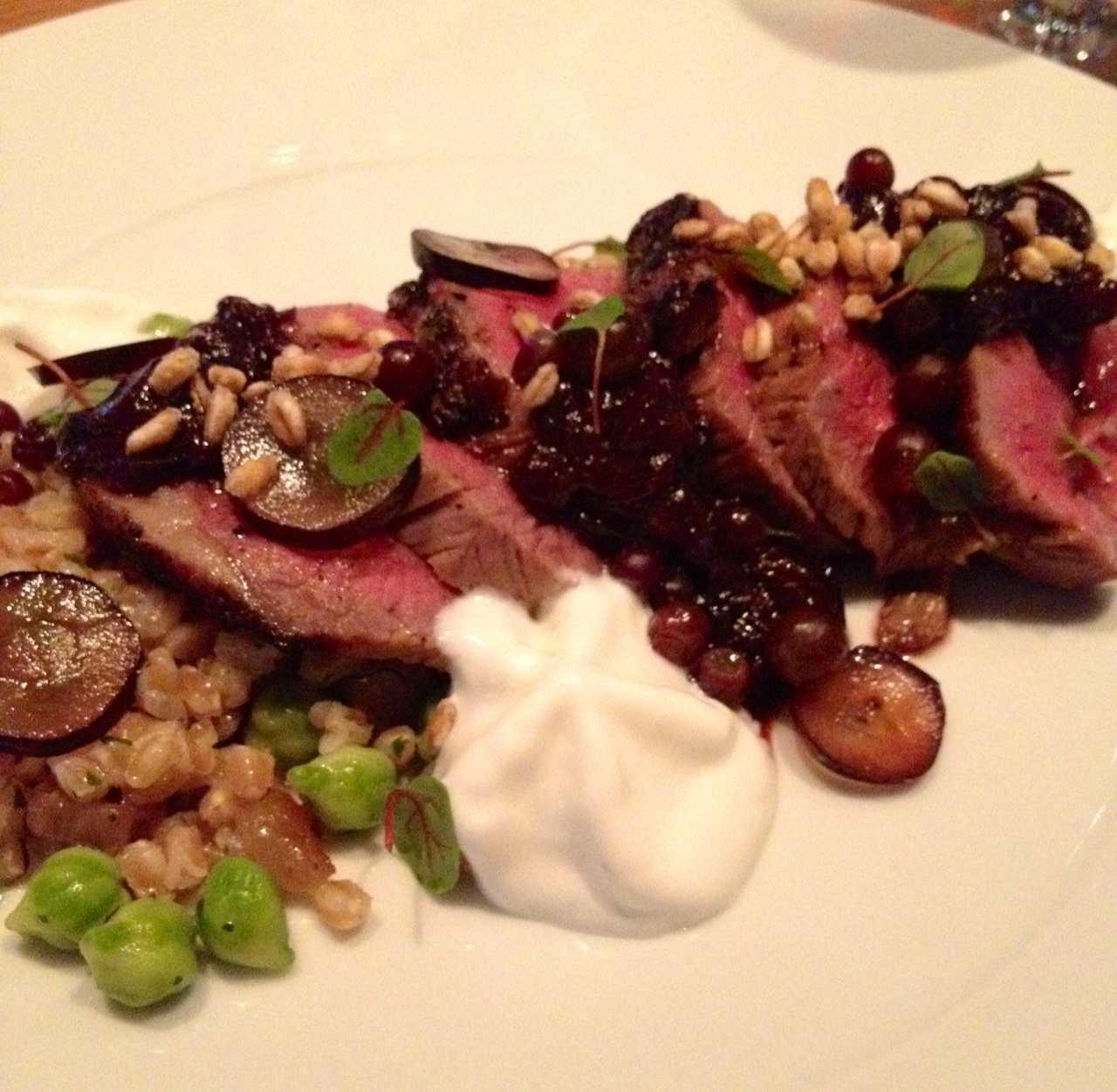 Aaand for the lamb. I’m salivating just writing about it. This entree was so multi-dimensional that sometimes it was hard to even discern what delicious morsel I was tasting. The lamb sirloin was super tender and perfectly cooked to medium-rare, served over a bed of farro mixed with chick peas and bits of flavorful lardo. (Which, if you’re not familiar with lardo, is basically herb-cured, slightly sweet, creamy FAT.) The whole thing was topped with some kind of champagne grape chutney-like concoction that was rich, dark, jammy, sweet and smoky all at once.